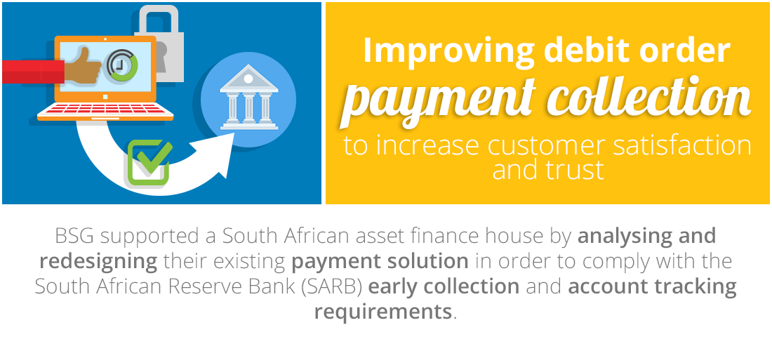 As part of the project BSG supported the enablement of compliant monitoring of the customer account for funds when the debit order is submitted during the early window period for collection. Should the customer not have any funds in their account on the day of collection, this collection method tracks the account for a set period of days in case funds do become available. The solution also provides a compliant process to handle disputes, checking debit orders against customer mandates and preventing the resubmission of identical collections.